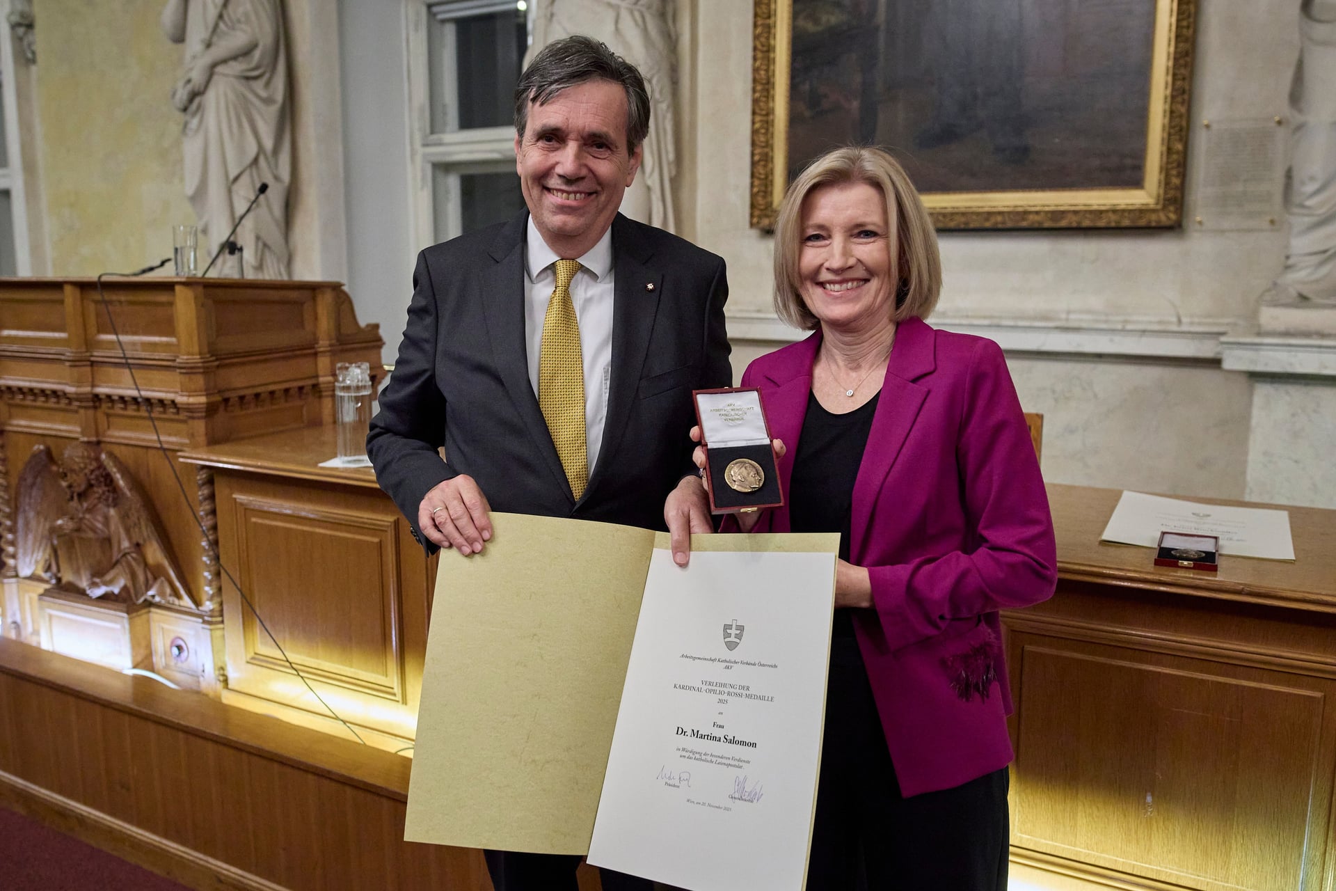 Wien, 20.11.2025 (KAP) Die Journalistin und Kurier-Herausgeberin Martina Salomon ist von der Arbeitsgemeinschaft Katholischer Verbände (AKV) mit der Kardinal-Opilio-Rossi-Medaille ausgezeichnet worden. Neben Salomon erhielten auch der Historiker Prof. Ernst Bruckmüller sowie Friedrich Birkner am Donnerstagabend im Alten Rathaus in Wien die "höchste Auszeichnung", die vom katholischen Verbandswesen seit nunmehr 40 Jahren vergebe wird, wie AKV-Präsident Matthias Tschirf betonte. Im Rahmen des Festakts wurde zudem die AKV-Ehrenpräsidentschaft an Helmut Kukacka, Staatssekretär a.D., verliehen.